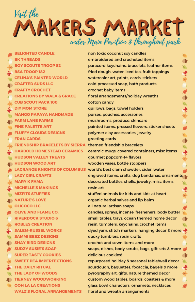 Our MAKERS MARKET during our Fall Festival is a growing success! The main pavilion will be filled to the max with delicious homemade treats, along with beautiful handmade pottery, soaps, home decor, candles, artwork, stationary, bird houses, ceramics, photography, wood art, knits, macrame and so much more! The perfect time for the community to get a jump on holiday shopping… we expect Fall as well as Holiday and general items!